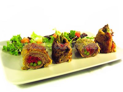 Flamenquines rellenos de jamón, pimiento y espárragos con ensalada variada