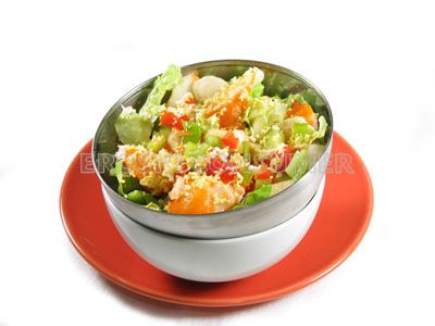 Introducimos una base de mayonesa con lechugas troceadas en juliana y sobre ella el salpicón de cangrejo aliñado con aceite de oliva y vinagre de manzana.