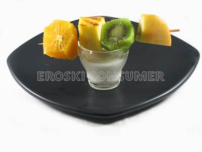 Esta receta nos da una buena idea de cómo preparar sabrosos y originales postres sin que éstos tengan un contenido de grasa ni azúcares excesivamente elevado. La fruta es el ingrediente principal, fuente de vitaminas, minerales y sustancias con acción antioxidante. Al prepararla a modo de brocheta la presentación es mucho más atractiva que si la fruta se toma entera y sin mezclarla con otras. Para completar la presentación de este saludable postre se emplea yogur desnatado que va a aportar un toque de sabor muy agradable sin apenas elevar el contenido calórico de las frutas.