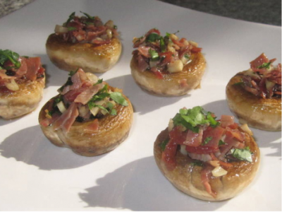 Los champiñones son alimentos con un bajo contenido en hidratos de carbono. Constituyen una buena fuente de vitaminas y minerales, así como de sustancias con acción antioxidante, grandes aliadas de nuestra salud. Suponen un modo muy sabroso de acompañar a platos tanto de pasta, como de arroz, carne o pescado, y es una buena alternativa para que personas con problemas de peso acompañen sus platos y les den un toque de sabor además de un aspecto muy apetecible. En esta receta, los champiñones se preparan rellenos de cebolla y jamón. La cebolla va a conseguir incrementar la presencia de vitaminas y minerales en el plato, mientras que el jamón supone una buena fuente de proteínas de alto valor biológico. No obstante aquellos que deban reducir el contenido de sal de su alimentación pueden substituir el jamón serrano por otros ingredientes, como espárragos o gambas.
