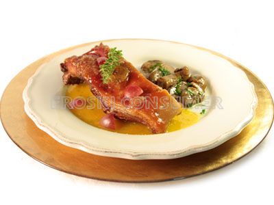 Servimos acompañado de una crema de calabaza y naranja junto con unos hongos salteados.