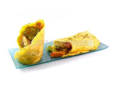 Hacemos 4 tortillas francesas de 2 huevos cada una con la que enrollamos dentro las verduras en tempura.