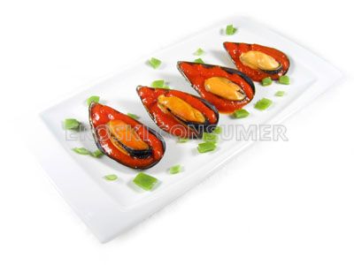 Los mejillones se sirven con una valva y rociados con la salsa de tomate caliente.