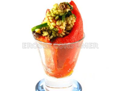 Los pimientos son una de las hortalizas que más se utilizan para cocinar rellenas gracias a su forma, muy apropiada para prepararlos de este modo. Los pimientos se pueden rellenar de prácticamente cualquier alimento que se desee, si bien en este caso se ha utilizado como ingrediente principal el arroz. La utilización de arroz en el relleno de platos aporta una buena cantidad de hidratos de carbono y debe ser tenida en cuenta. El relleno se completa con cebolla y tomate quienes junto a los pimientos, harán que este plato presente un buen contenido de vitaminas y minerales.