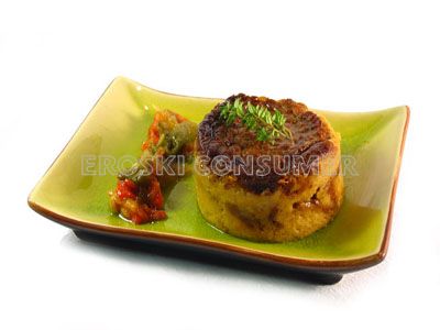 Servimos en platos colocando el pastel en el centro y los demás ingredientes de la escalibada que hemos reservado alrededor decorando.