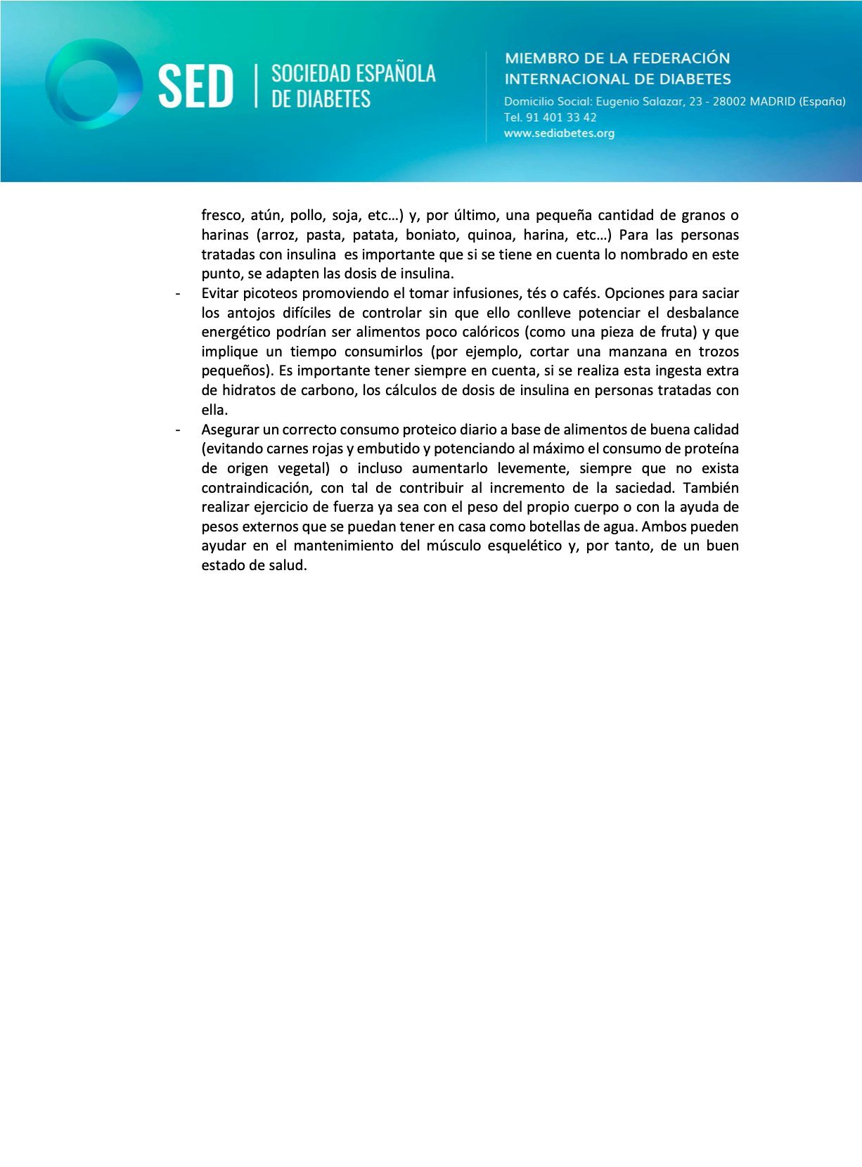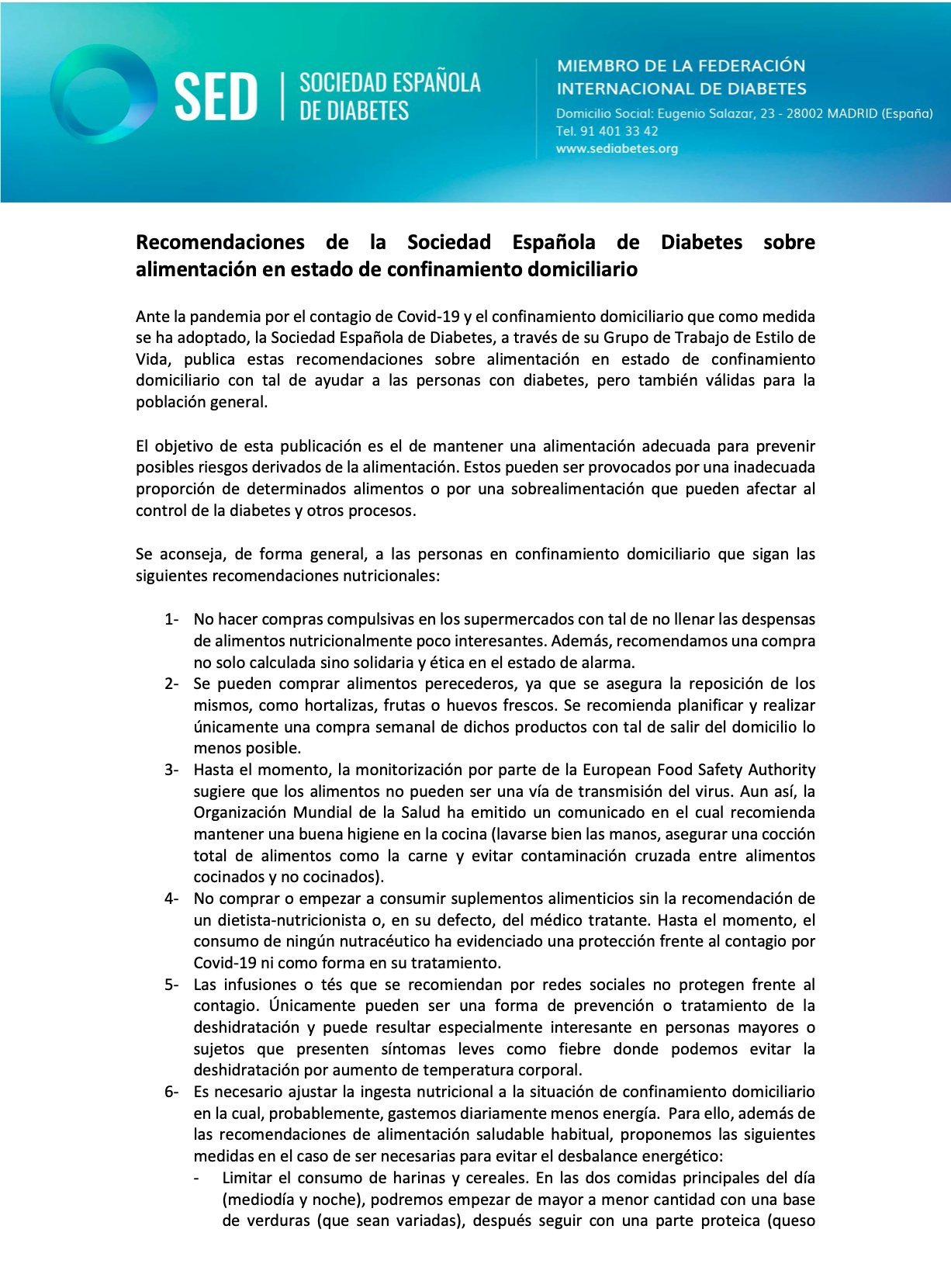 La Sociedad Española de Diabetes (SED), hace unas recomendaciones de cómo seguir una buena alimentación en el estado de confinamiento domiciliario.