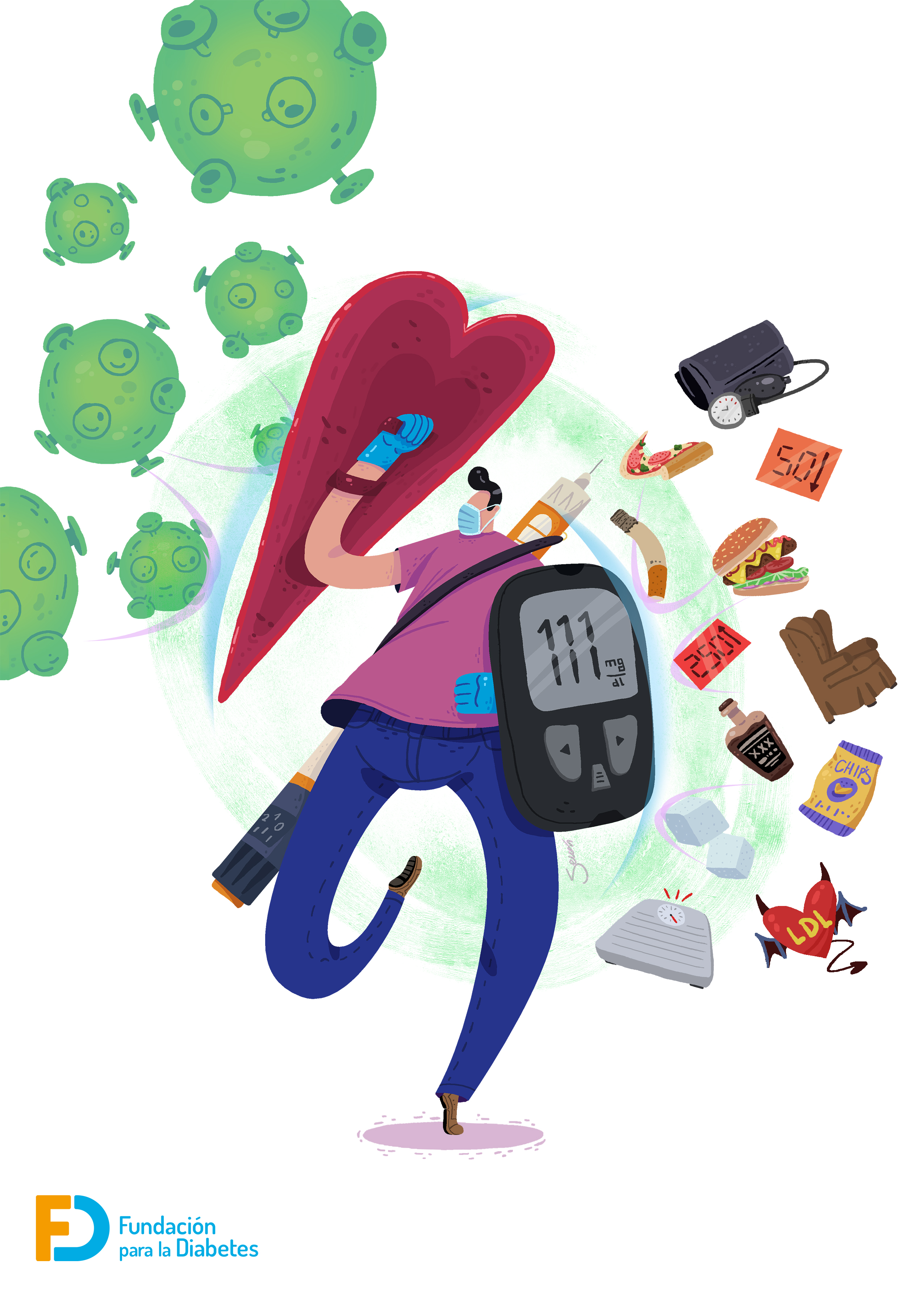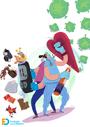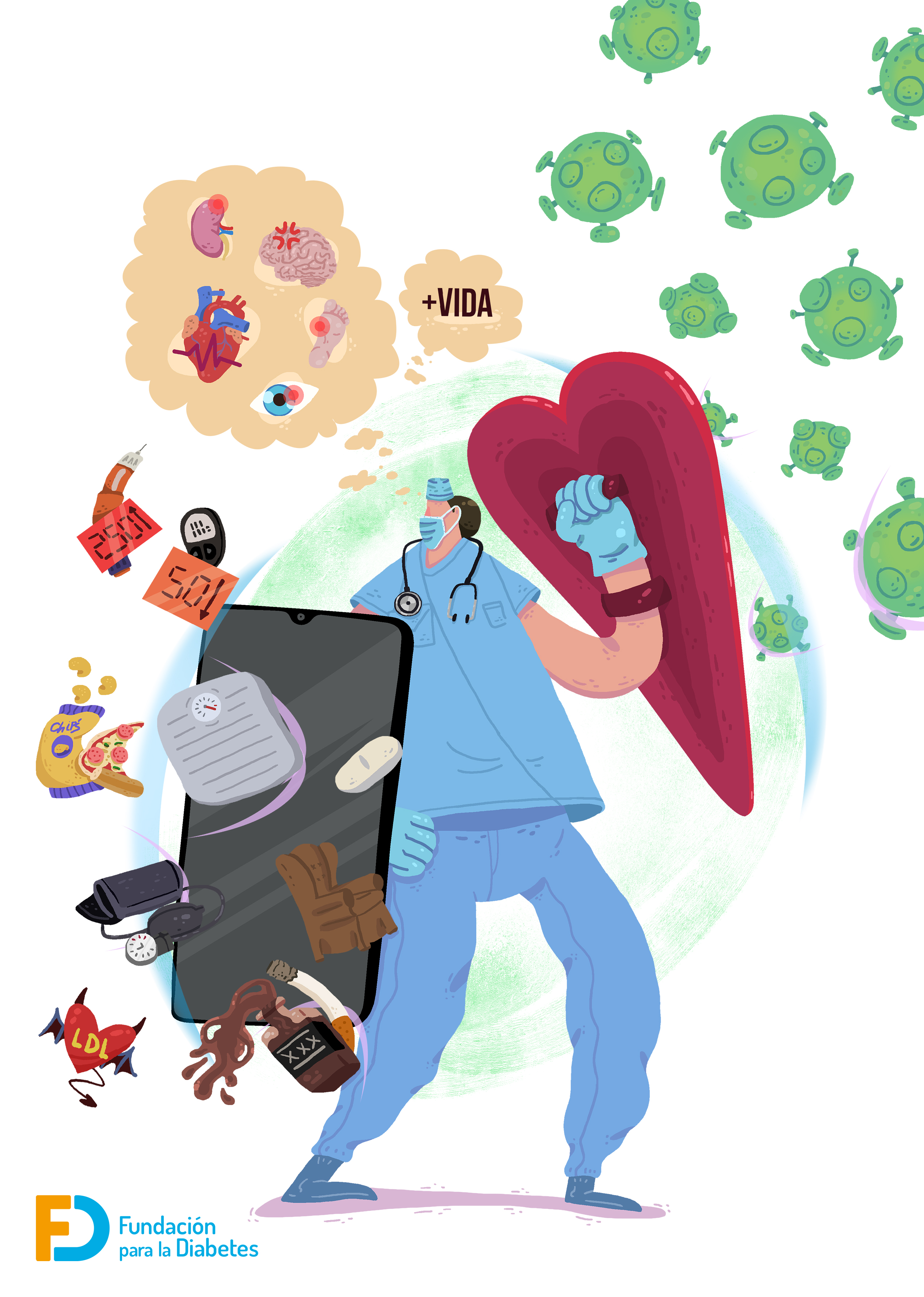 Frente a la doble pandemia de la diabetes y el coronavirus, profesionales sanitarios y pacientes se han unido para trabajar juntos como verdaderos superhéroes. Con esta serie de ilustraciones elaboradas junto a Cristóbal Morales hemos querido rendir homenaje a su labor diaria. A los profesionales sanitarios, que se han desvivido cada día por mantener un buen control de los factores de riesgo cardiovascular en sus pacientes con diabetes. Y a los propios pacientes, que se han visto en la posición de enfrentarse con la mejor disposición a este doble reto".