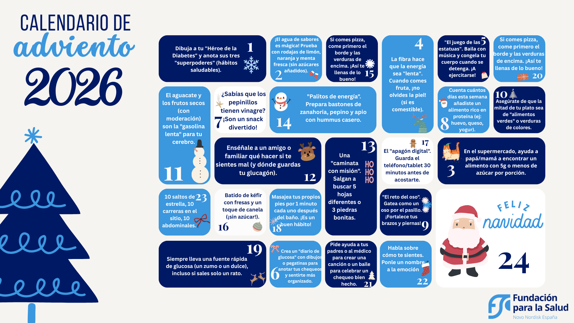 Una aventura mágica de 24 días para los más pequeños de la casa. Retos divertidos, recetas coloridas y consejos para ser un "superhéroe" de la salud. Aprender sobre la diabetes es un juego emocionante con toda la familia. ¡Que el fin de año sea saludable y muy, muy divertido!