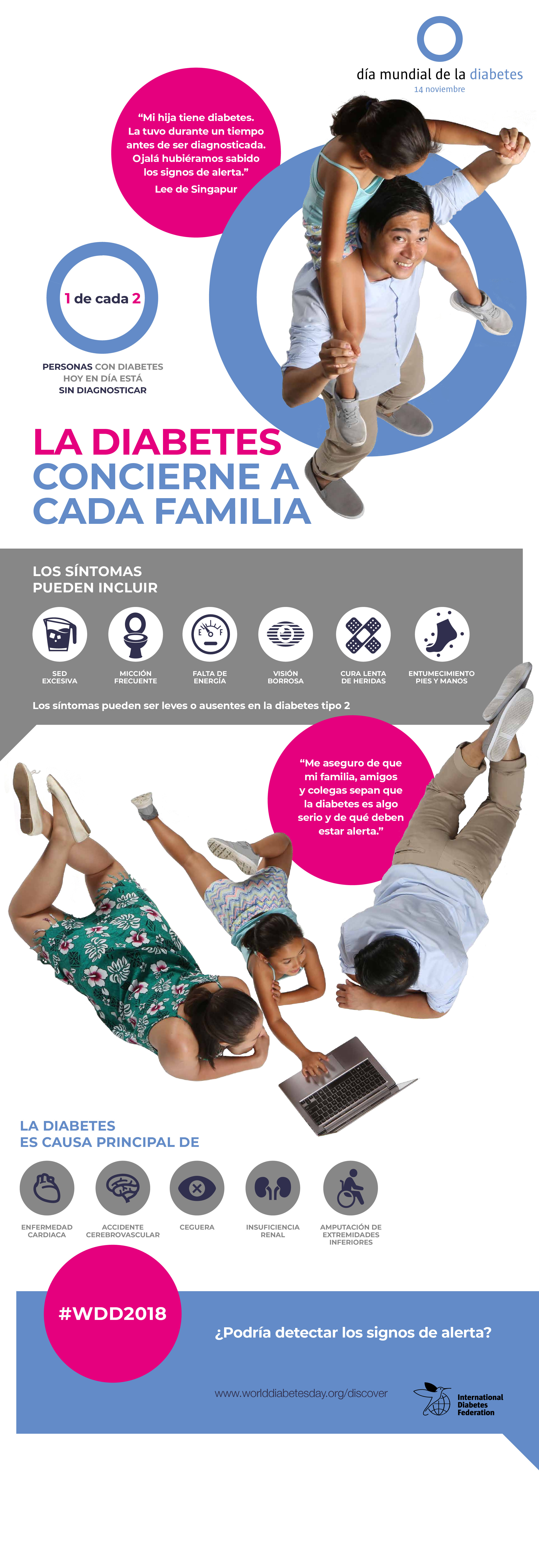 Una infografía que subraya que la diabetes concierne a cada familia, recordando como poder detectarla en algunos caso. Difundida por la IDF (International Diabetes Federation) con motivo del Día Mundial de la Diabetes 2018.