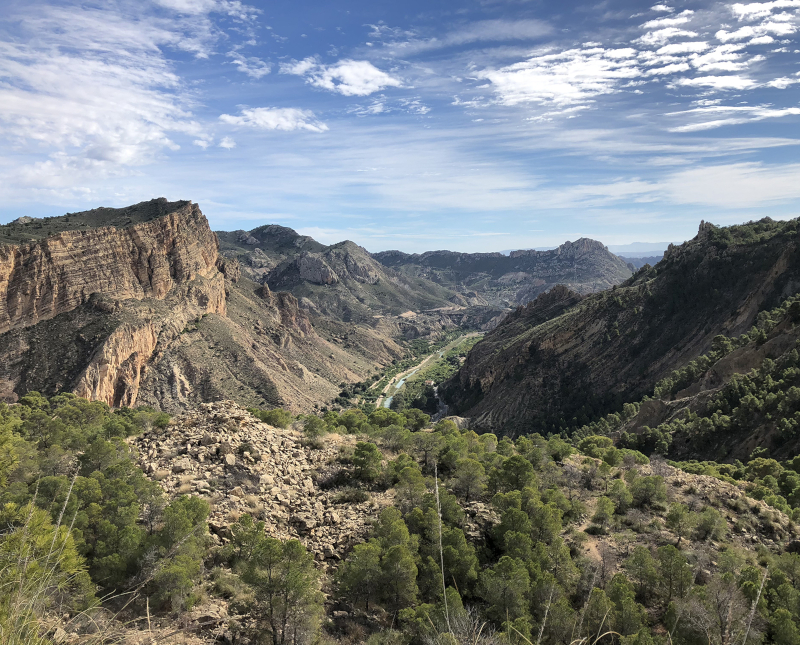 2. Embalse de la Cierva: Esta ruta da comienzo en el embalse de la cierva en la localidad de Mula, se puede aparcar en el área recreativa que hay al cruzar la presa, el sendero nos lleva por el borde del embalse y donde podemos disfrutar de su frescura. Rodeando el embalse podemos contemplar los increíbles sectores de escalada de el Abuelo y el Ferrari. La ruta nos lleva hasta el nacimiento de Fuente Caputa, nombre proveniente de la Época Romana caput (cabeza) y acqua (agua), caputa, «cabeza del agua«.Siguiendo el surco del río, el cual discurre entre vegetación de ribera como Valadres; continuamos caminando por la rambla del Perea, la increíble erosión ha dado forma a este lugar, crea ndo paredes desplomadas que son usadas por escaladores. Saliendo de la rambla y continuando por el precioso paisaje se vuelve a llegar al embalse de la Cierva el cual deja unas vistas increíbles desde arriba.