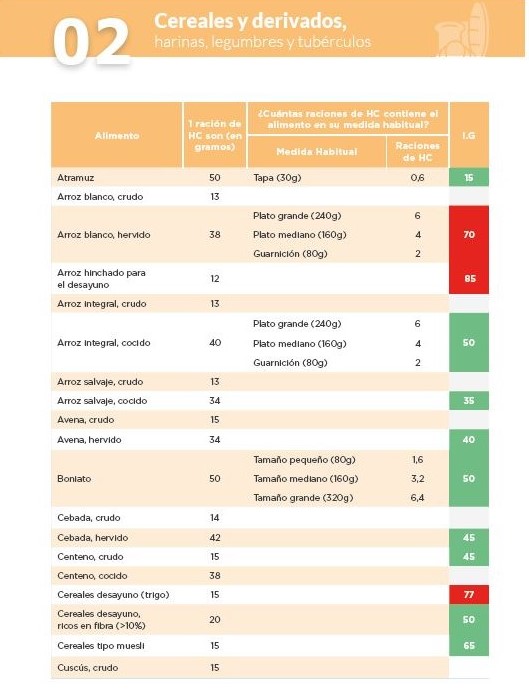 La tabla ofrece un listado de los alimentos que contienen hidratos de carbono. Junto a cada alimento encontraréis la cantidad de alimento que contiene 1 ración (10g) de hidratos de carbono. Además, os mostramos cuál es la medida habitual de consumo de ese alimento, sus raciones de hidratos de carbono y el índice glucémico de muchos de estos alimentos.