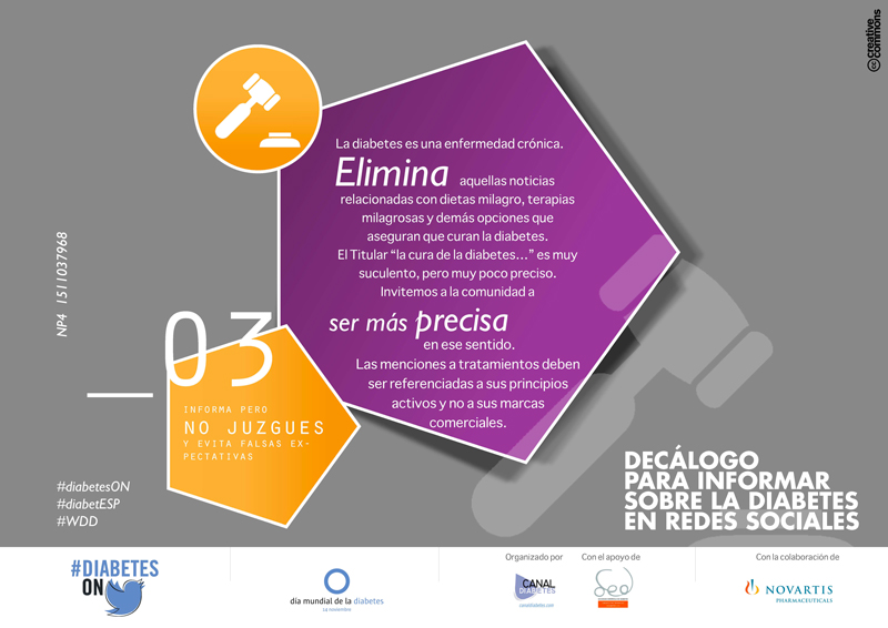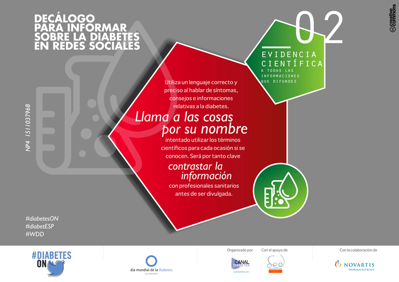 Utiliza un lenguaje correcto y preciso al hablar de síntomas, consejos e informaciones relativas a la diabetes. Llamar a las cosas por su nombre intentado utilizar los términos científicos para cada ocasión si se conocen. La información 2.0 se presta además a comunicar sin contrastar. Será por tanto clave contrastar la información con profesionales sanitarios antes de ser divulgada.