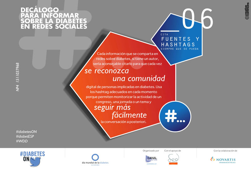 Cada información que se comparta en redes sobre diabetes, si tiene un autor, sería aconsejable citarlo para que cada vez se reconozca una comunidad digital de personas implicadas en diabetes. Usar los Hashtag adecuados en cada momento. Permiten monitorizar la actividad de un congreso, una jornada o un tema y seguir más fácilmente la conversación a posteriori.
