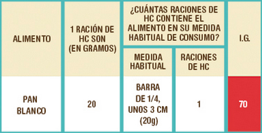 Según la tabla: “1 ración de HC son (en gramos) = 20” → Esto quiere decir que cada 20g de pan contienen 1 ración (10g) de HC.