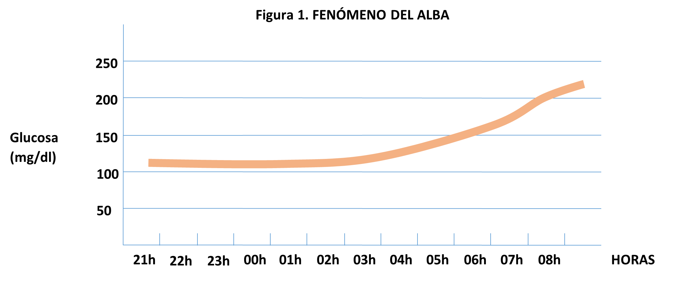 El fenómeno del alba se describe como la tendencia a aumentar los niveles de glucosa en sangre a primera hora de la mañana, aproximadamente a partir de las 5:00h, y que se mantiene pocas horas después de levantarse. Este fenómeno es secundario a un incremento de la secreción de hormona de crecimiento a partir de esa hora. La hormona de crecimiento tiene un efecto hiperglucemiante, es decir, aumenta la glucosa en sangre a través de que estimula la producción de glucosa en el hígado. Por lo tanto, el incremento de los niveles de hormona de crecimiento produce un aumento de glucosa en sangre a pesar de haber administrado la dosis adecuada de insulina. Este mecanismo, aunque puede existir en otras edades, es más potente durante la pubertad ya que es el momento de máxima secreción de hormona de crecimiento.