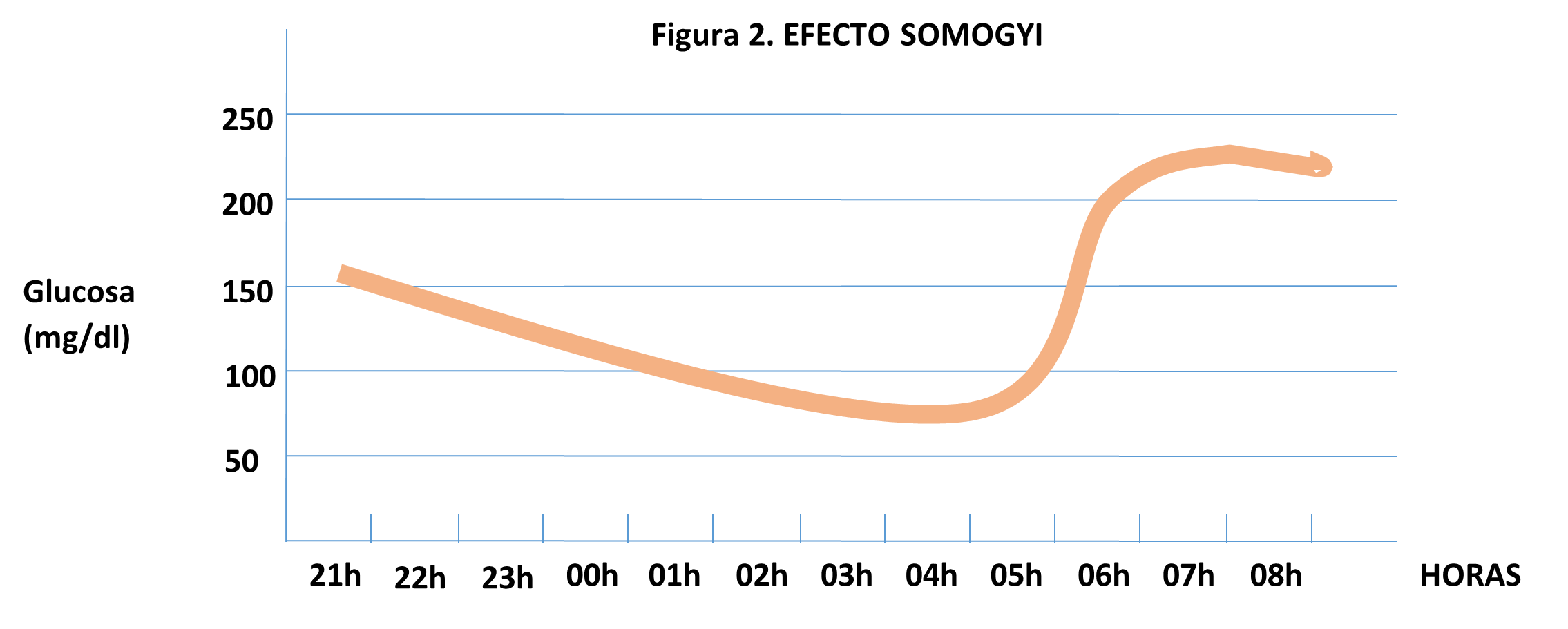 El efecto Somogyi es necesario conocerlo para poder diferenciarlo correctamente del fenómeno del alba. Se trata de un aumento del valor de glucosa a primera hora de la mañana (podría parecer al fenómeno del alba), pero esta hiperglucemia es de “rebote”, es decir, que es secundaria a un episodio de hipoglucemia que ha ocurrido por la noche. Cuando hay una hipoglucemia por la noche, se activan todas las hormonas que intentan aumentar la glucosa para compensarlo y esto resulta en una hiperglucemia posterior. Para solucionar este fenómeno es necesario evitar la hipoglucemia que se produce por la noche, por lo tanto, sería conveniente valorar si precisa disminuir la dosis de insulina de acción prolongada.
