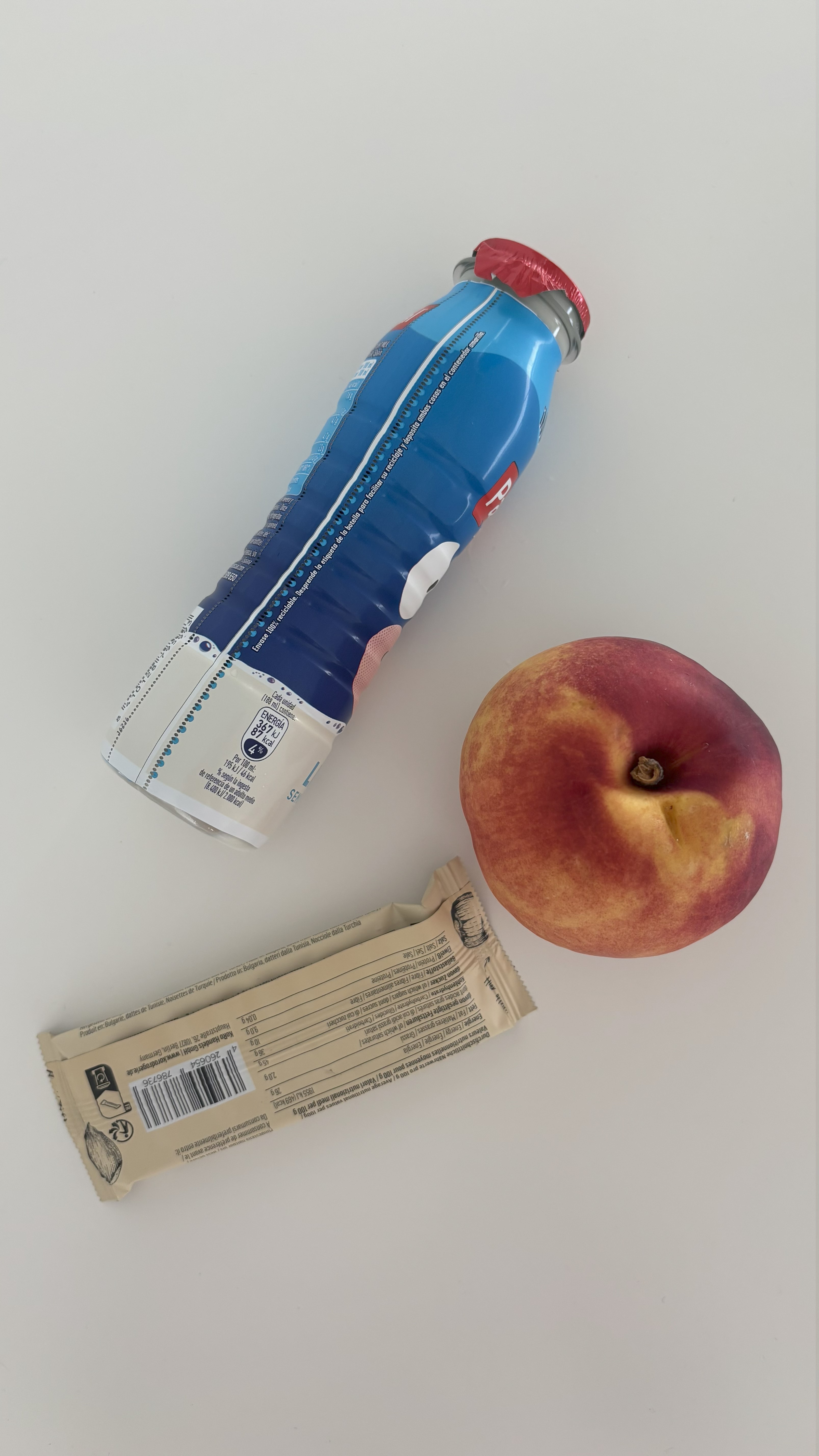 Barrita de frutos secos + mini brick de leche + fruta fresca.