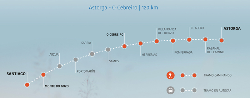 El reto estaba compuesto por seis etapas del Camino de Santiago Francés, concretamente entre Astorga y O Cebreiro. Desde O Cebreiro se realizó un tramo en autobús hasta Monte de Gozo donde un nutrido grupo de amigos, familiares y otras personas se sumaron al grupo para mostrar su apoyo y acompañar a nuestros peregrinos caminando juntos hasta la meta: Santiago.