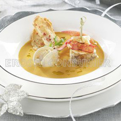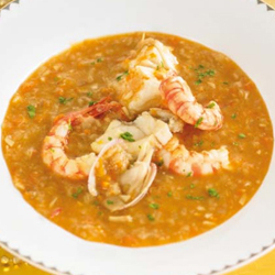1er. Plato: Souquet de pescado y marisco con brocheta de rape y bogavante