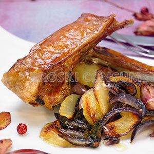 2º Plato: Costillas y paletilla de cordero de leche asado con patatitas y cebolla confitada