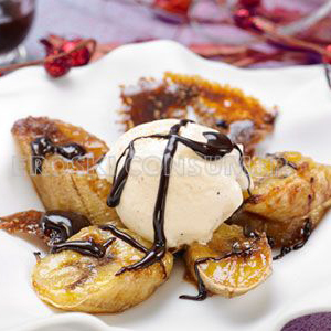 Postre: Plátano asado con helado de vainilla y chocolate templado