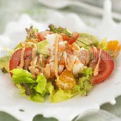 1er. Plato: Ensalada de gambones con aguacate y salsa cocktail