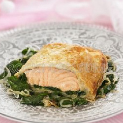 2º Plato: Salmón en costra de hojaldre sobre cama de espinacas