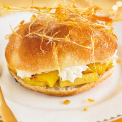 Postre: Láminas de hojaldre, piña, caramelo hilado y nata