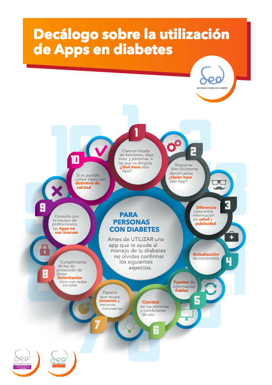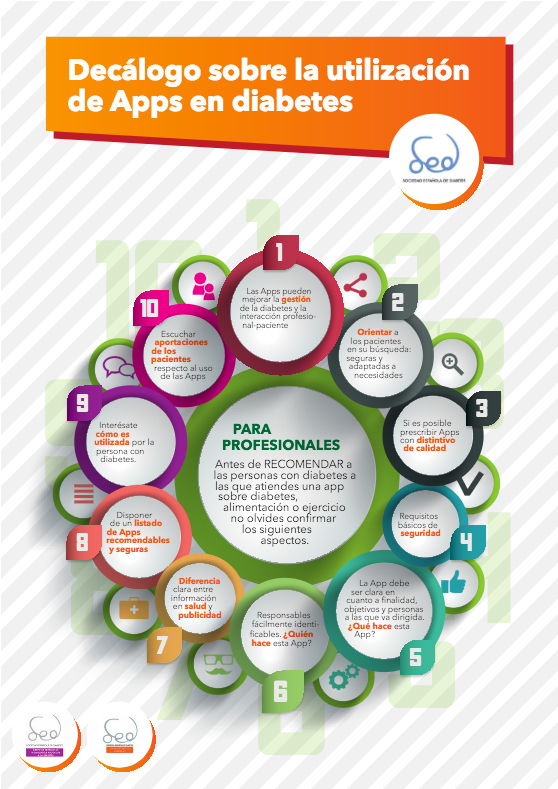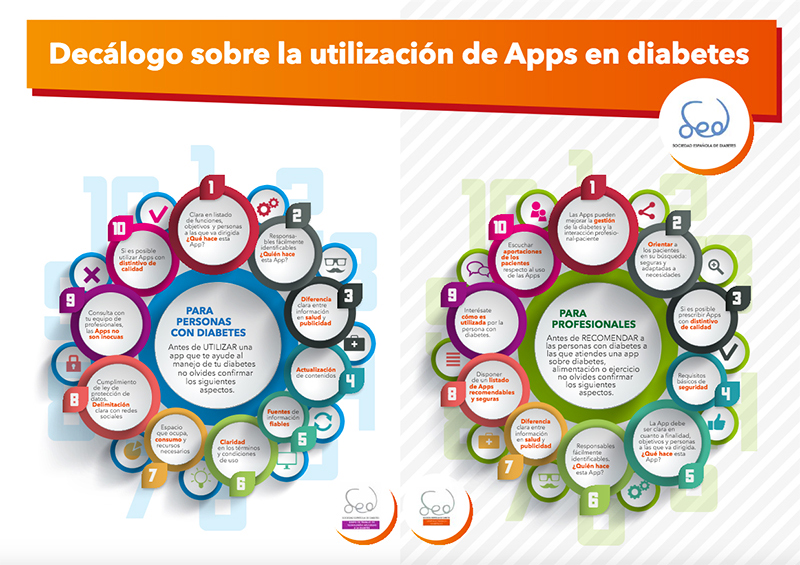 Los grupos de trabajo de Tecnologías aplicadas a la diabetes y Diabetes 2.0 de la Sociedad Española de Diabetes han elaborado conjuntamente un decálogo sobre la utilización de Apps en diabetes, con consejos tanto para profesionales, como para personas con diabetes.