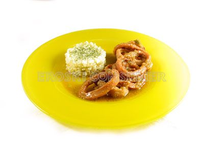 Los calamares pertenecen al grupo de los mariscos, por lo que presentan unas propiedades nutricionales comunes a la mayor parte de estos animales. Por lo general son buena fuente de proteínas de alta calidad además de contener pocas calorías, debido principalmente a su bajo contenido graso. Es rico en vitaminas y diferentes minerales, cuyo contenido en esta receta se ve incrementado gracias a la presencia de pimiento y cebolla, buena fuente de estos nutrientes y de sustancias antioxidantes. Aunque los mariscos en general contengan colesterol, conviene tener en cuenta que este tipo de alimentos no forman parte de nuestra dieta diaria, por lo que consumirlos de vez en cuando no presenta ningún problema en relación con un aumento en el nivel de colesterol sanguíneo.