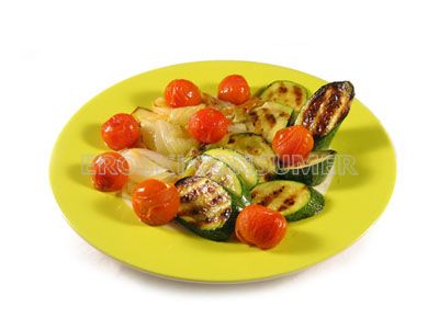 Los calabacines a la brasa, pueden utilizarse como entrantes de una comida, o como guarnición de cualquier plato tanto de carne como de pescado. En este caso se acompañan de tomatitos enanos por lo que la presencia del plato va a ser muy atractiva. Además ambos alimentos poseen un bajo contenido calórico, mientras que por otro lado son ricos en diferentes sustancias muy interesantes desde el punto de vista nutricional, como vitaminas, fibra y sustancias con acción antioxidante. Además la original presencia del calabacín cortado y cocinado a la brasa, así como la de los tomatitos enanos, puede servir para llamar la atención de los más pequeños y conseguir que se animen a consumir estos alimentos.