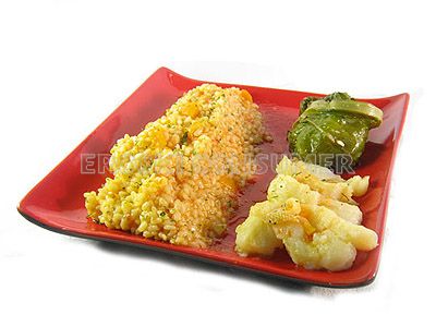 Una vez cocido el arroz con las verduras servimos el arroz con los rollitos de pescado envuelto en las hojas de acelgas, que deberemos de calentar en el último instante encima del arroz.