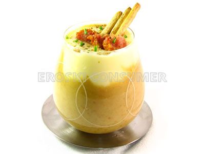 Vertemos la crema de lentejas en una copa de boca ancha, sobre ella un poco de puré de patata refinado con aceite de oliva y nata liquida con un punto de sal y pimienta.