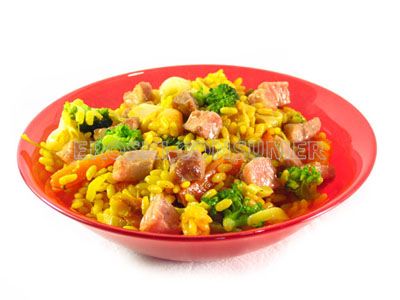 El arroz es un cereal muy común en la cocina de cualquier país y combina prácticamente con todos los alimentos (carnes, pescados, verduras, leche, frutos secos...). En esta receta, por la combinación de sus ingredientes, se obtiene un plato completo y equilibrado, al igual que los potajes o los estofados de patata, verduras y carne o pescado. En esta receta el aporte total de hidratos de carbono es muy elevado, por lo que se recomendaría valorar la cantidad de arroz utilizada en la receta. La carne de cerdo supone además una fuente importante de minerales (potasio, fósforo, sodio, calcio y magnesio) y de vitaminas liposolubles y del grupo B. Las hortalizas, enriquecen el plato sabor, textura y color, además de vitaminas, minerales y fibra. Esta preparación no es especialmente grasa, no obstante, no deja de ser un plato energético, por lo que se ha de consumir con moderación si se sigue una dieta de adelgazamiento. A quienes padecen trastornos digestivos (hernia de hiato, dispepsia, gastritis y úlcera), la carne guisada no les suele sentar bien. El arroz es un alimento contraindicado en caso de estreñimiento, aunque las verduras compensan la ausencia de fibra de dicho cereal. En caso de hipertensión, se prescindirá de la sal y se pueden añadir a la receta especias o hierbas aromáticas y limón para realzar su sabor y hacerlo aún más apetecible. Dado que en general se abusa del consumo de proteína animal, los guisos y estofados de este tipo, dando preferencia a las carnes menos grasas, combinadas con vegetales, son una opción saludable. Así, con un primer plato de ensalada variada y fruta de postre, obtenemos un equilibrado menú. Esta receta, es adecuada para cualquier persona sana.