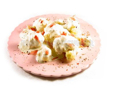 La coliflor es una verdura de bajo valor calórico que pertenece a la familia de las brasicáceas, rica en compuestos de azufre y vitamina C (se pierde en parte con la cocción), ambos de acción antioxidante. Además es rica en minerales y aporta vitaminas del grupo B y fibra que mejora el tránsito intestinal, a la vez que su contenido en hidratos de carbono es inferior al 3%. El resto de ingredientes, aumentan el contenido graso de la receta (bacon, mantequilla, queso azul) y también de otros nutrientes; vitaminas del grupo B y liposolubles (A, D) y minerales como el calcio (leche y queso). Se trata de una receta de alto valor calórico, rica en grasas saturadas y colesterol, si bien, consumida de modo ocasional, es apta para todos los grupos de edad. Para personas que requieren de dietas bajas en calorías o grasas, no es recomendable, así como para quienes tienen alteraciones digestivas, ya que la coliflor es una verdura flatulenta. Para mejorar su digestibilidad conviene añadir comino, hinojo... o bien tomar una infusión digestiva o carminativa (que facilita la expulsión de gases), al final de la comida. De segundo plato, se recomienda escoger una carne o pescado magros y de elaboración sencilla (plancha, horno, brasa).