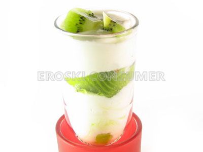 Receta ligera, refrescante y nutritiva, indicada para personas de todas las edades. Una forma diferente y deliciosa de contribuir al aporte de calcio que precisa el organismo para mantener en buen estado nuestros huesos y dientes. Además, tanto el yogur, por su contenido en bacterias saludables, como el kiwi, rico en fibra, hacen que la receta esté especialmente indicada en caso de estreñimiento. Desde el punto de vista nutritivo, además el yogur aporta vitaminas del grupo B (entre las que destaca la riboflavina o B2) y vitaminas liposolubles A y D; esta última necesaria para el buen aprovechamiento del calcio por parte de nuestro cuerpo. El kiwi por su parte es una de las frutas con más contenido de vitamina C. Prescindir del azúcar y tomar la receta al natural o endulzado con sacarina, la hace más adecuada en caso de diabetes, exceso de peso e hipertrigliceridemia, enfermedades en las que conviene controlar el aporte de azúcares de la dieta. De este modo, la cantidad total de hidratos de carbono de este postre es equivalente al de una pieza de fruta de tamaño pequeño.