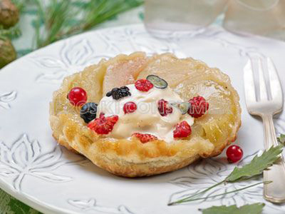 Original postre a base de peras y manazas con helado de vainilla. Las frutas aportan un toque de fibra, vitaminas C, antioxidantes y apenas calorías. Sin embargo, se basa en ingredientes de muy alto contenido en hidratos de carbono. Por ejemplo, la base de hojaldre se realiza a base de harina, o se utiliza azúcar para caramelizar la fruta. Además, se consume con helado de vainilla que suma calorías al plato. El helado no se ha incluido en el análisis nutricional. Esto supone un excelente postre de gran calidad y sabor, pero que se debe consumir con moderación y teniendo en cuenta el resto de platos que componen el menú. Podría ser recomendado como postre para deportistas o personas con gran actividad física o cabe la posibilidad de tomar una porción menor de esta tarta que aporte así menos hidratos de carbono (por ejemplo, la mitad).
