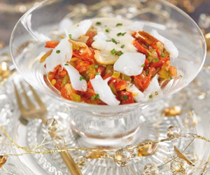 Por otra parte, se desmiga el bacalao con las manos y se agrega al sofrito de ajo arriero que ya estará listo (cebolla, pimiento verde, pimiento del piquillo y dientes de ajo, todo pelado y troceado en cuadraditos muy pequeños, brunoise). Una vez cocinada la verdura, se agrega un poco de tomate pelado y troceado sin agua. Se confita toda la fritada de verduras y, en ese momento, se pone el punto de sal y de azúcar. Se agrega el bacalao cocinado en láminas, se mezcla y se vierte en las copitas tipo tazas transparentes. Después, se corona con unas cucharadas de la salsa pil-pil, se decora con unos trocitos del ajo frito y guindilla, así como un poco de perejil o cebollino troceado.