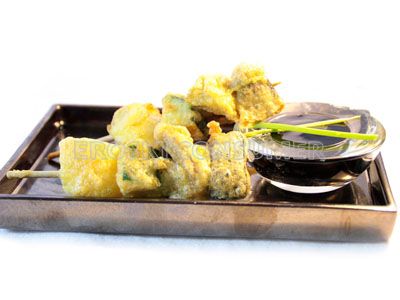 Insertamos en la brocheta el champiñón, el calabacín, la cebolleta y la berenjena, untamos en salsa de soja, escurrimos y pasamos por harina y huevo batido. Freímos en una sartén con abundante aceite caliente, de dos en dos, de manera que se doren por todos los lados. Sacamos de la sartén y escurrimos en una bandeja con papel de cocina.