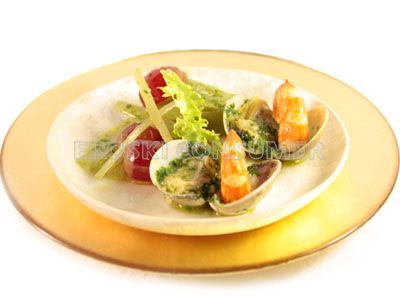 Cardo y escarola con almejas y gambones en salsa