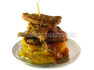 Servimos un pincho con unas patatas de base y sobre ellas unos trozos de entrecot cortado en tiras regulares y salseado con la salsa del desglase.